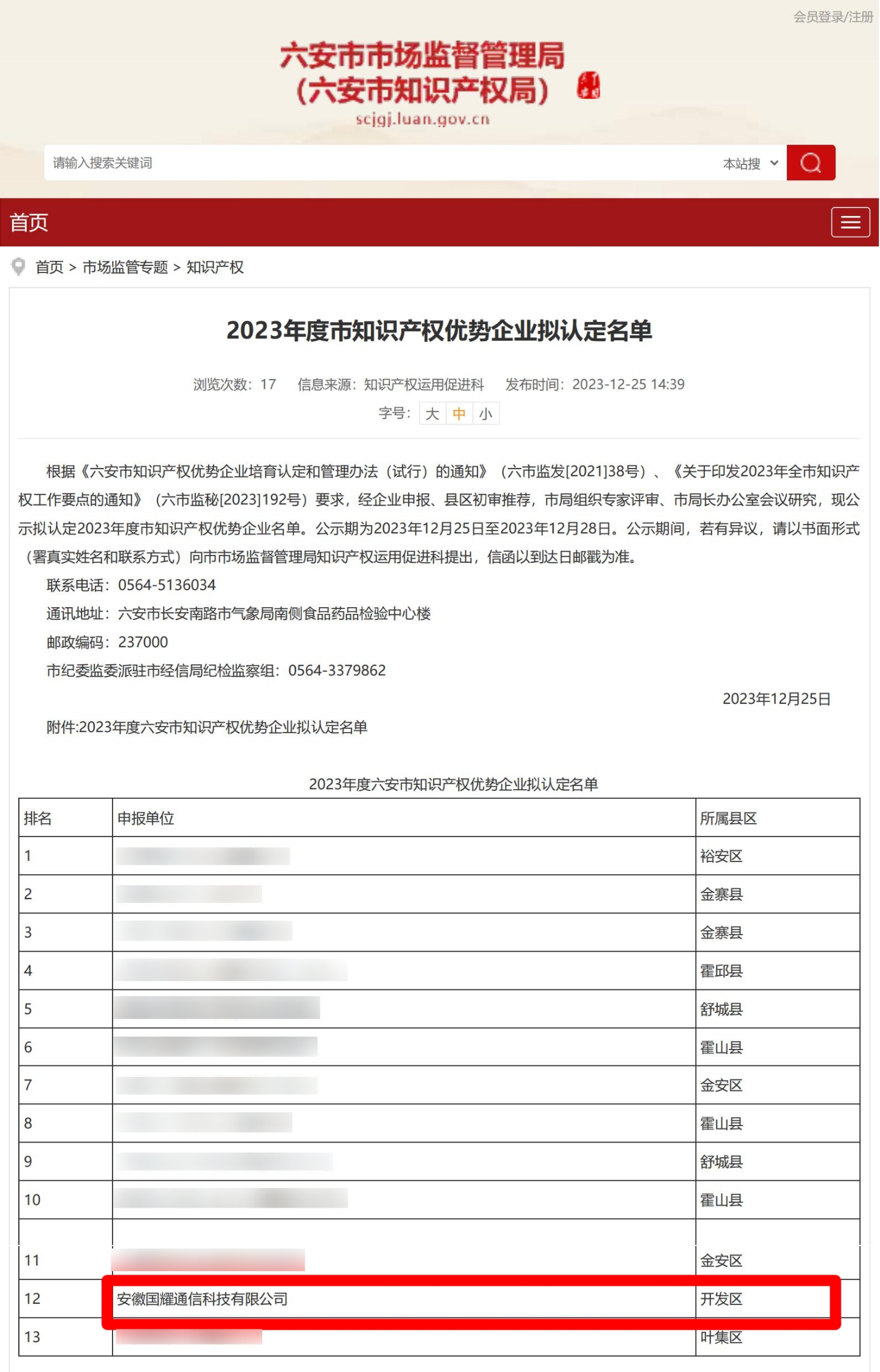 在創(chuàng)新的海洋中,我們揚(yáng)帆前行,致力于推動(dòng)科技進(jìn)步和知識(shí)產(chǎn)權(quán)的保護(hù)。我司憑借持續(xù)的努力和卓越的創(chuàng)新成果,被六安市市場(chǎng)監(jiān)督管理局、六安市知識(shí)產(chǎn)權(quán)局認(rèn)可,經(jīng)過評(píng)比公示,授予我司2023年度“六安市知識(shí)產(chǎn)權(quán)優(yōu)勢(shì)企業(yè)”榮譽(yù)稱號(hào)!