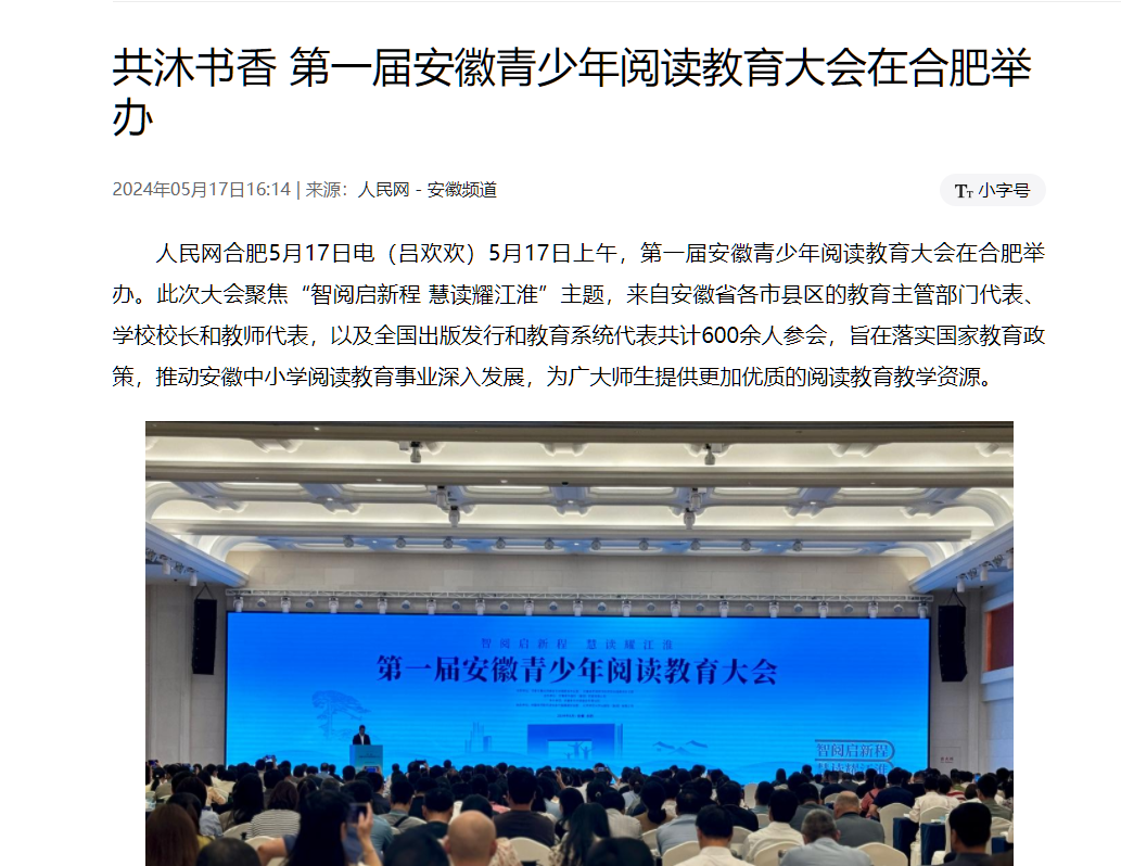 5月17日上午,第一屆安徽青少年閱讀教育大會(huì)在合肥舉辦。此次大會(huì)聚焦“智閱啟新程 慧讀耀江淮”主題,來自安徽省各市縣區(qū)的教育主管部門代表、學(xué)校校長和教師代表,以及全國出版發(fā)行和教育系統(tǒng)代表共計(jì)600余人參會(huì),旨在落實(shí)國家教育政策,推動(dòng)安徽中小學(xué)閱讀教育事業(yè)深入發(fā)展,為廣大師生提供更加優(yōu)質(zhì)的閱讀教育教學(xué)資源。