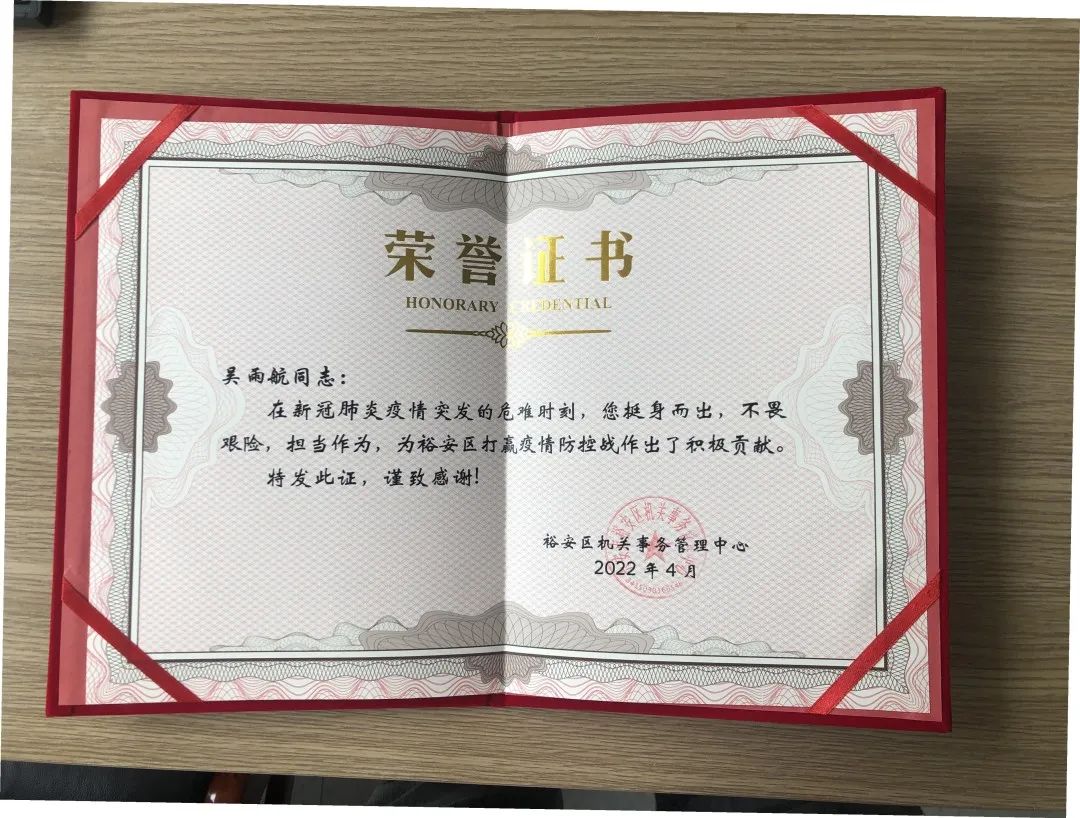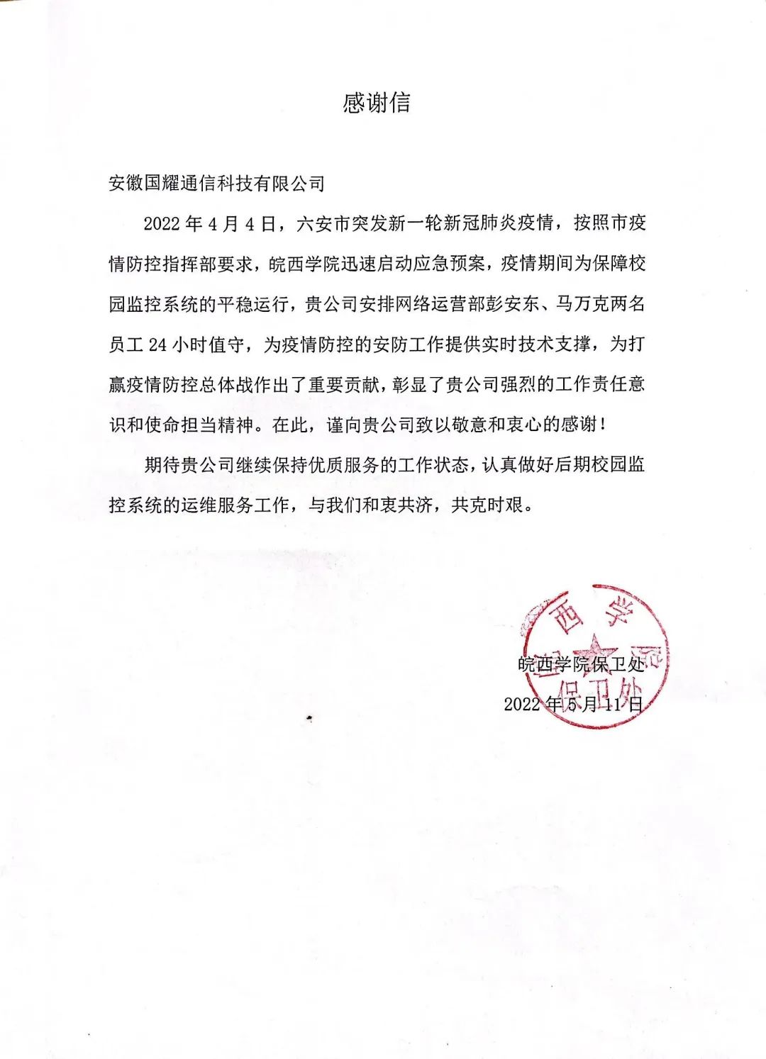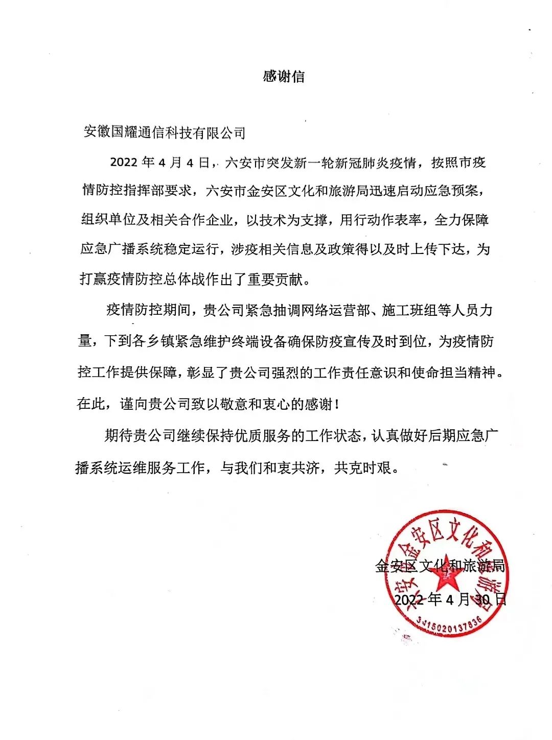 2022年5月1日,六安市金安區(qū)、裕安區(qū)事務(wù)管理服務(wù)中心,皖西學(xué)院,金安區(qū)文化和旅游局對國耀公司在抗疫期間參與的各項工作給予肯定,為我司頒發(fā)錦旗,并頒發(fā)抗疫人員榮譽(yù)證書,高度贊揚(yáng)國耀公司員工面對風(fēng)險不退縮、不畏懼,堅守崗位,共克時艱,保障了疫情防控期間工作的順利開展。