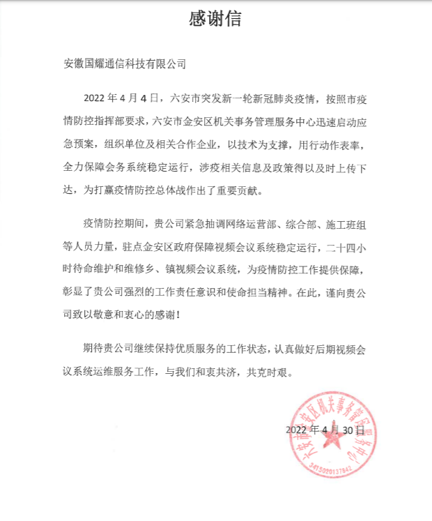 自2022年4月4日六安市新冠肺炎疫情發(fā)生以來,安徽國耀通信科技有限公司聞令出動、聽令而行,積極配合上級部門開展各項疫情防控工作,同時安排國耀公司網(wǎng)絡(luò)運(yùn)營部、綜合管理部及施工班組等人員,支援金安區(qū)、裕安區(qū)機(jī)關(guān)事務(wù)管理服務(wù)中心視頻會議保障等工作,危難時刻,挺身而出,連續(xù)堅守崗位26天,立足崗位職責(zé),牢記使命在肩,服務(wù)抗疫大局。