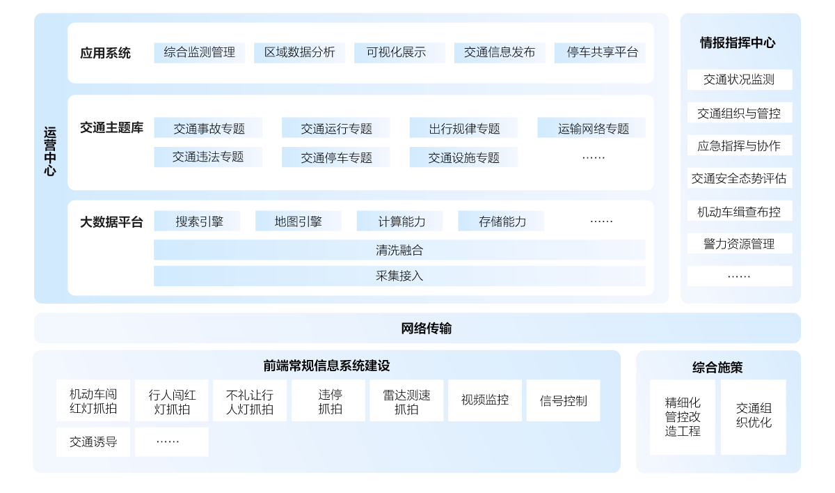 智慧交通概述智慧交通建設(shè)分為情報(bào)指揮中心、交通平臺(tái)、